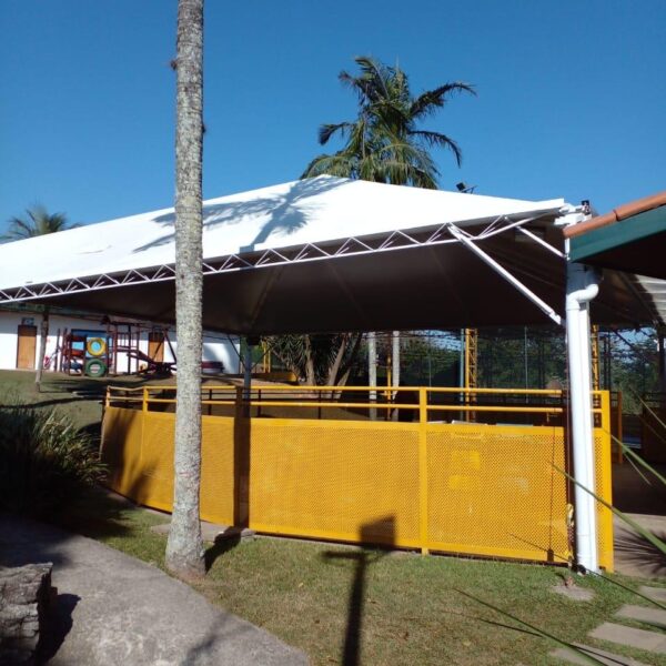 Quadra poliesportiva coberta: Área protegida para aulas de educação física e práticas esportivas coletivas.